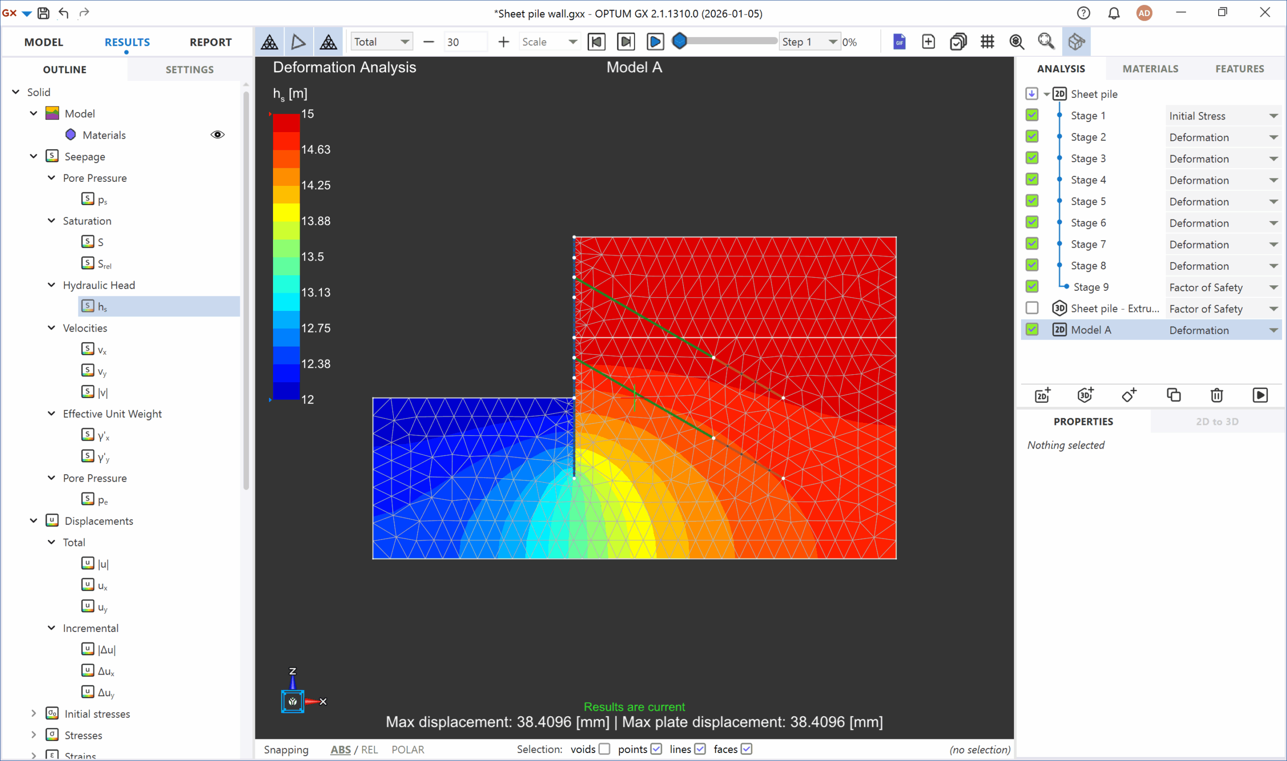 Staged construction is modelled explicitly, allowing excavation phases, support installation, and groundwater control measures to be assessed step by step. Each stage updates stresses, deformations, and stability automatically, providing insight into system performance throughout construction. This integrated workflow supports consistent, traceable engineering decisions without manual recalculation between stages.